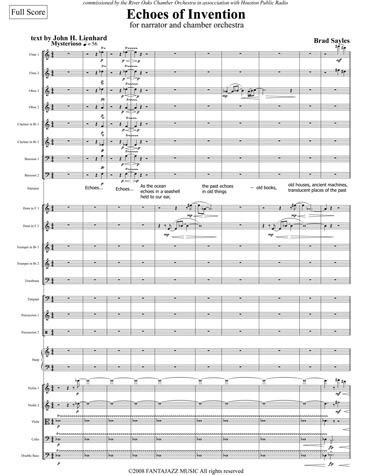 Echoes of Invention composed April 2008 premiered by the River Oaks Chamber Orchestra Joel Smirnoff, conductor Dean Dalton, narrator text by John Lienhard, Ph.D. 18 minutes Score and parts available. |