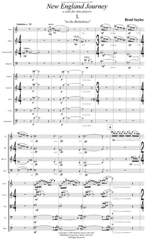 New England Journey (Nonet) composed 2002 premiered by the Moores School Wind Quintet and strings 18 minutes This is a programatic piece recreating the sounds and feelings I had on a first trip with my wife to New England. The work is in three movements. Score and parts available. |