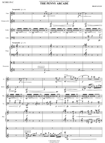 The Penny Arcade composed 2008 This piece was commissioned by AURA, the contemporary music ensemble at the Moores School of Music. It is set for a rather standard set of mixed instruments. It was premiered at the Moores Opera House on February 25, 2008 by AURA, Rob Smith, music director. 7 minutes |